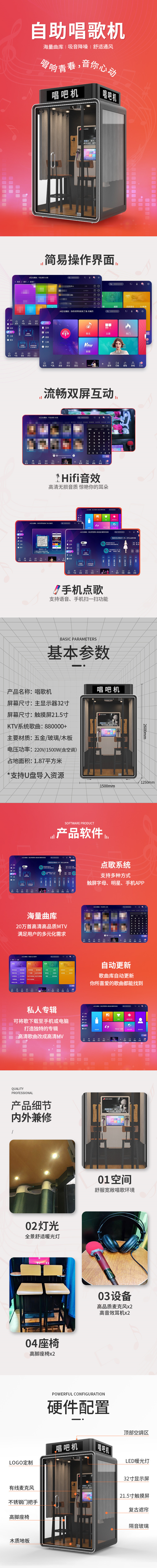 产品特点:这款豪华版唱吧机箱是采用的半挂形式,整体看起来非常美观大气,占地面积1.87平方米。KTV系统歌曲88万+,支持U盘导入歌曲,不定时更新曲目,可手机点歌 支持语音、手机扫一扫功能,HIFI音效 高清无损音质 惊艳你的耳朵!