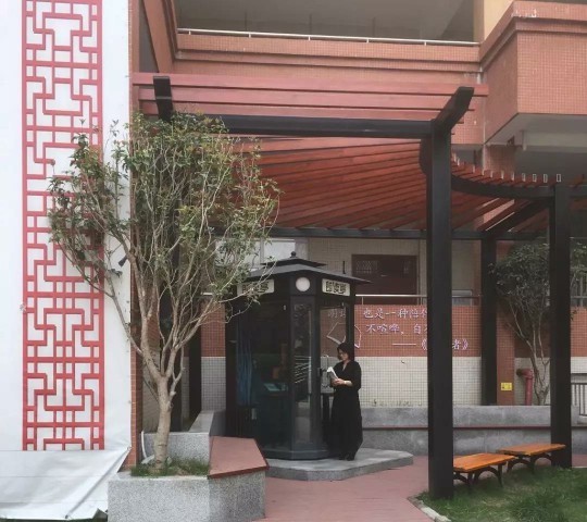 朗读亭,座落在学??蒲デ暗亩卟萜罕呱希庑嗡聘垂诺缁巴?,温暖大气,让人神往。它占地约2平方米,可谓麻雀虽小五脏俱全——专业的音响系统、电子屏幕、氛围灯光一应俱全,系统自带大量的数字朗读资源:每学期必读书籍中的某些篇章或古诗词,语文教材中的某篇课文及节选,以及教育部推荐的网络阅读平台中的中华经典等多种类型的书目供选择。每位朗读者进门后对着麦克风就可以开始朗读自己心目中的好文章。